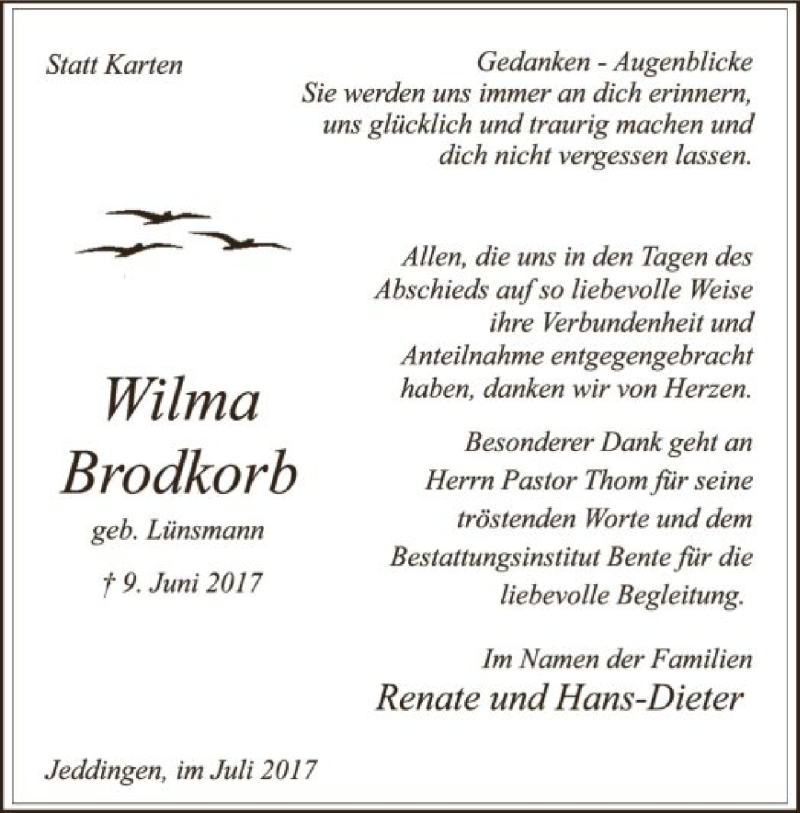 Hier finden Sie alle Traueranzeigen aus der Zeitung, die bisher für Wilma Brodkorb erschienen sind. Weitere Traueranzeigen, die in der Zeitung erscheinen, werden hier ebenfalls aufgelistet