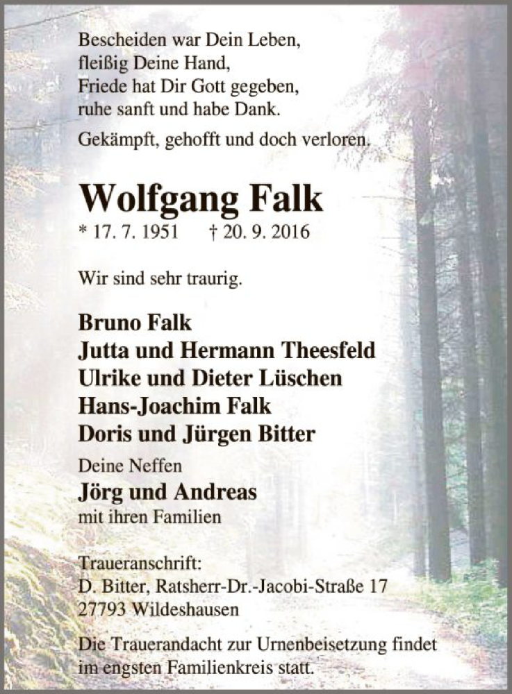 Hier finden Sie alle Traueranzeigen aus der Zeitung, die bisher für Wolfgang Falk erschienen sind. Weitere Traueranzeigen, die in der Zeitung erscheinen, werden hier ebenfalls aufgelistet