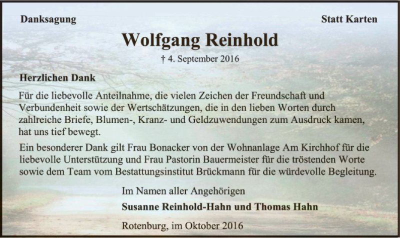 Hier finden Sie alle Traueranzeigen aus der Zeitung, die bisher für Wolfgang Reinhold erschienen sind. Weitere Traueranzeigen, die in der Zeitung erscheinen, werden hier ebenfalls aufgelistet